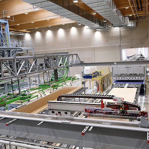 The changes in society towards the conservation of resources and the advancing technical development bring the use of wood back into the focus of construction projects. For the production of multilayer cross laminated timber elements, BÜRKLE supplies you with lines including feeding, lay-up area, gluing, press and de-stacking.