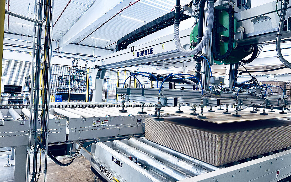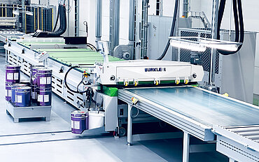 Other technical highlights of the line include high-quality roller coating machines for optimum coating results and the handling concept developed by Bürkle. The UV systems are state of the art and are characterized by high performance and long lamp life. In addition, all systems are equipped with energy-efficient motors and are designed to be easy to operate and maintain. The integration of third-party components and the system integration by Bürkle project management were crowned with success.
