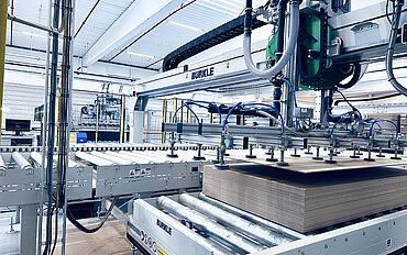The central system control is the intelligent heart of the system. It coordinates the individual processing stations, manages the parameters required for production and records the machine data. Furthermore, extensive status and fault messages are provided for the effective operation of the system. The system is also equipped with the Bürkle Remote Service System. This system guarantees access to all relevant system elements for fault diagnosis and troubleshooting, whereby the Bürkle technicians in Freudenstadt have direct access to the system control and the operating terminals via a remote desktop. The control system has been specially adapted to Decospan's requirements to ensure smooth data exchange with Decospan's higher-level IT systems.