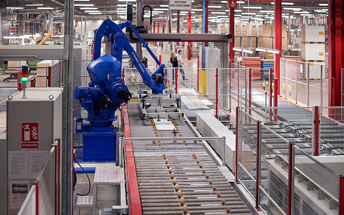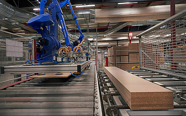 An additional requirement was the integration and consolidation of differently structured machine controls. The task was to combine the Yaskawa feeding and stacking robotics with the Wehrmann control technology and the Siemens control system in the Bürkle plant section. A joint project team from all three partners mastered this task.