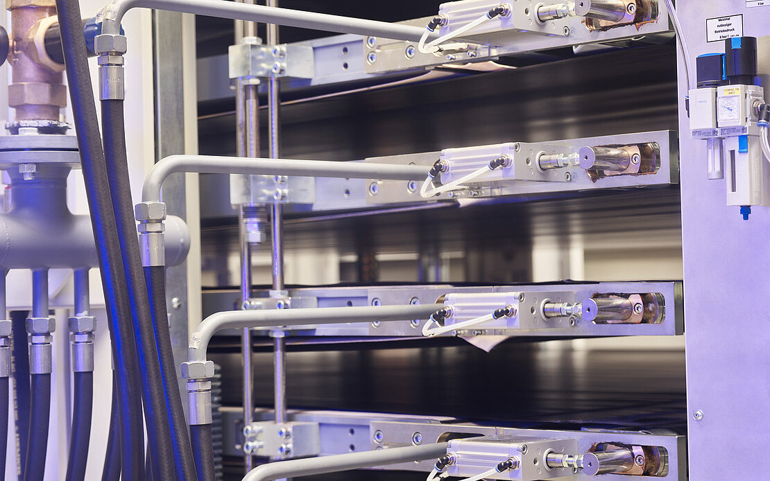 The laminators have a press dimension of 2.2 by 2.4 meters, designed so that two modules per tier can be inserted and processed at the same time – depending on the dimensions. Some manufacturers have moved to larger module formats, however, Meyer Burger’s products are aimed at the rooftop market where size and weight are more limited. So, the largest module produced by Meyer Burger measures roughly 1.04 x 1.76 m.
