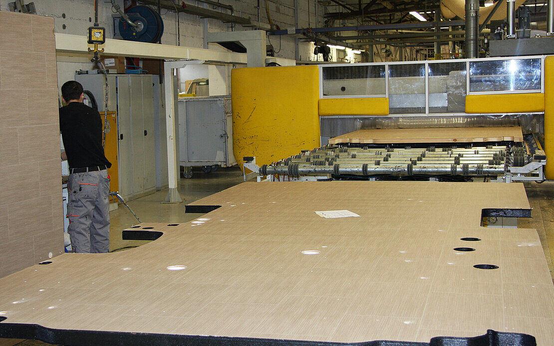 After the pressing process and controlled pressure build-up as well as short waiting time the finished sandwich element comes out, the protective film is removed. Finally, the elements are positioned on a roller track and turned and move into a machining centre. After a certain conditioning time and further processing, the side walls enter eventually the vehicle assembly where their installation takes place.