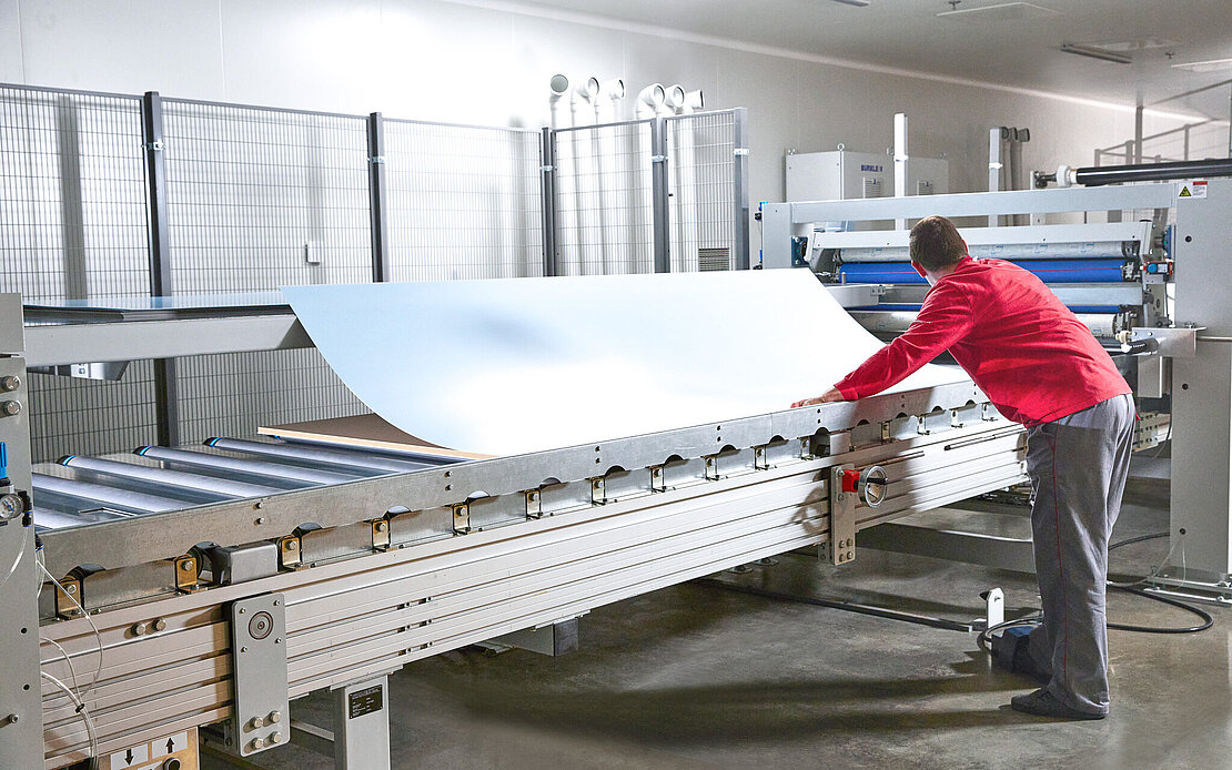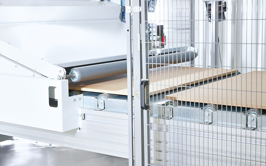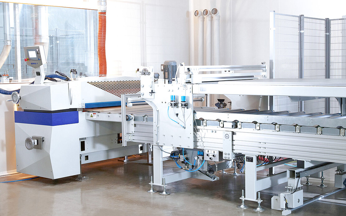 In order to be able to operate the line as flexibly as possible with one person, it was particularly important to Salex to be able to apply the surface materials to the carrier plates with different feed variants as required. In the end, there were three different variants that enable both sheet material and continuous laminating operation from the roll. When feeding the sheet material in the transverse direction, the surface material is applied manually. The laying table is then either in a fixed position (small parts) or it is moved by motor via foot pedal. In semi-automatic operation, a cleaning and feeding unit applies the sheet material lengthwise. A sensor on the roller conveyors ensures that the carrier plate is positioned correctly.