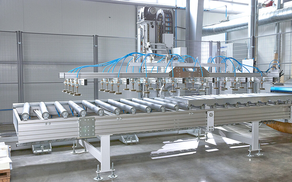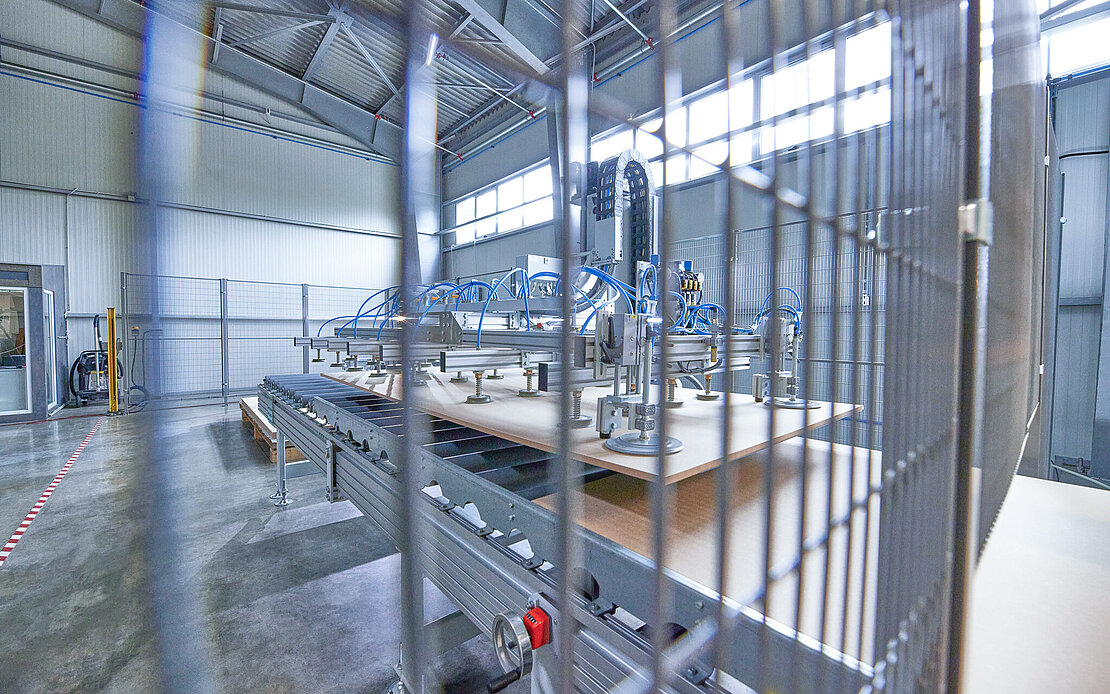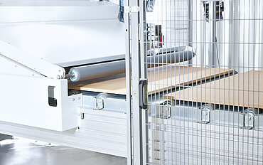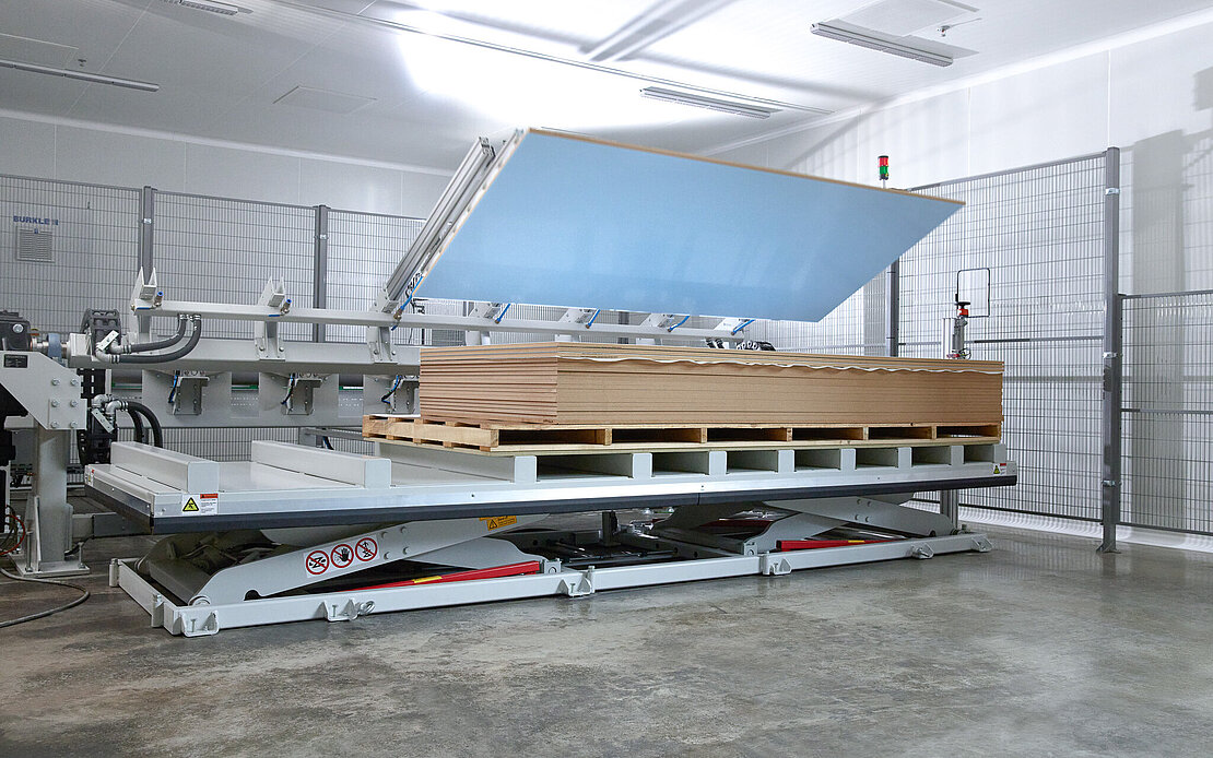In the destacking area itself, there is a vacuum turning device for destacking the finished panels, which are turned 180 degrees and stacked after cleaning with the turning device. A new function allows the process to be interrupted if necessary in order to insert a protective film between the individual panels.