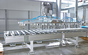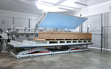 The raw and finished stacks and the different surface materials are handled by a forklift operator during everyday production. At the infeed of the line, a vacuum loading system takes over the fully automatic loading - especially for large quantities. Each finished workpiece, which has been automatically stacked, is cleaned with a moistened brush at the end of the cycle before it is transferred to the destacking area. The Sword Brush before destacking serves as additional cleaning to prevent marks from forming in the stack. This is the only way to maintain the high quality standard.