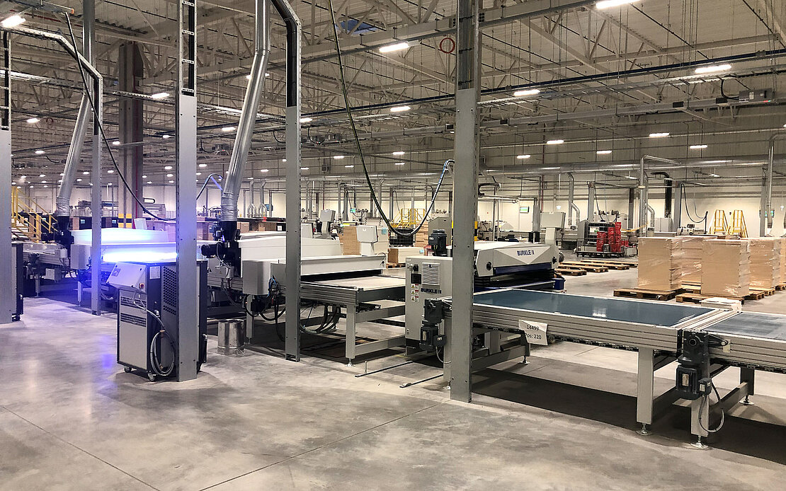 coat by three roller coaters arranged one behind the other in the line, each of which is followed by a UV-LED system that ensures that the basecoat gels. The final 3 - 8 g/m² of basecoat is applied by two further roller coaters, each followed by a UV system with two lamps and one with three lamps for curing. Belt conveyors are located between the production units to ensure smooth, synchronised transport of the workpieces. The central line control is equipped with the Bürkle Remote Service System. This system ensures access to the line elements for troubleshooting, i.e. direct access to the line control by the Bürkle technicians in Freudenstadt via remote desktop. All single machines were accepted by Bürkle experts in Freudenstadt. The subsequent transport of the line to Lithuania was unproblematic without any special incidents. The only problem was that the lorry driver could not find the customer's address at the first attempt, as it was located in the completely new industrial area, which was not yet listed on Google Maps or in the memories of the navigation devices. All machine parts (of course) still arrived on time at the installation site at Vilniaus Baldai in September 2019. All machine parts (of course) still arrived on time at the installation site at Vilniaus Baldai in September 2019. Two Bürkle fitters were on site for final assembly at the beginning of 2020. They were supported by (at least) five employees of the customer. An installation time of eight weeks was estimated, but the installation had to be forcibly interrupted in March due to Covid 19 quarantine regulations. Finally, in late November to early December 2020, staff were trained to carry out theperformance run with material on 8 December, which went without incident and achieved the warranty. The customer is very satisfied with the plant performance in production practice so far.