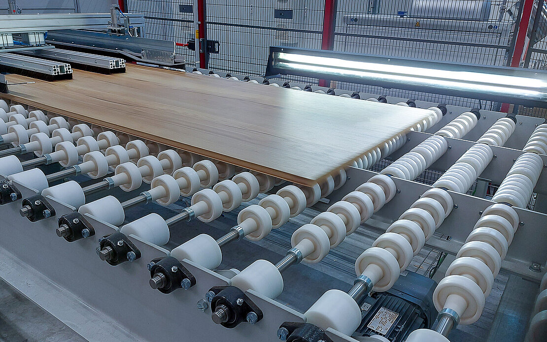After preheating in the plant, the panels are glued. Around 50 grams of PVAc adhesive are applied to both sides of each square meter of panel, followed immediately by drying in the infrared zone. Depending on the surface, lamination can now take place at a temperature of 50 to 150 degrees. The panels then enter the fully automatic edging system. Here, the excess film is removed from all four sides of the panel. At the same time, the length, width and angularity are trimmed to their final dimensions. The boards are then ready and are transported via the destacking area to the so-called frame end department for further processing.
