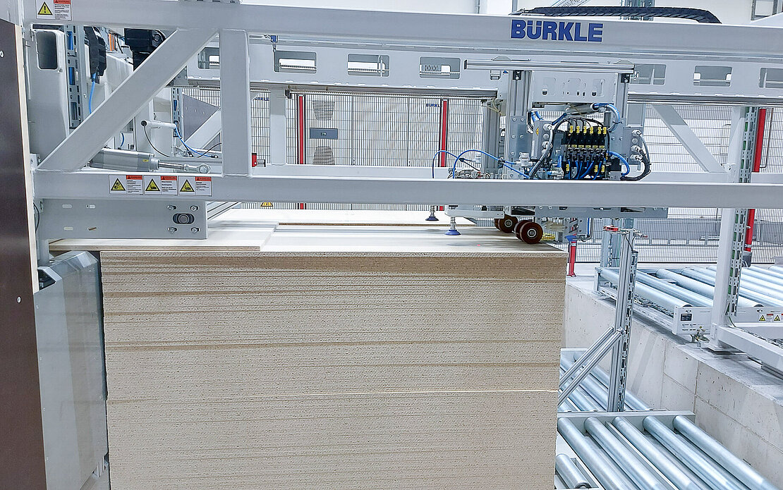 However, before the 75-metre-long line could be installed, the hall intended for it had to be completely renovated. The lamination area is now separated from the outside and from the raw material warehouse by airlocks. Five pits of different sizes and depths had to be integrated so that the entire process can be operated at ground level. These pits are used for feeding and stacking, for example. The heart of the system, the BÜRKLE laminating station, measures an impressive 15 meters. It took around 12 months from planning and commissioning to delivery. The installation of the line alone took five months.